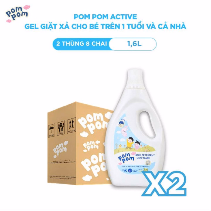 [2 Thùng] Gel Giặt Xả 2in1″Lành” Cho Cả Nhà Pompom Active – Tích Hợp Kháng Khuẩn An Toàn Cho Đồ Lót – 8 Chai 1.6L