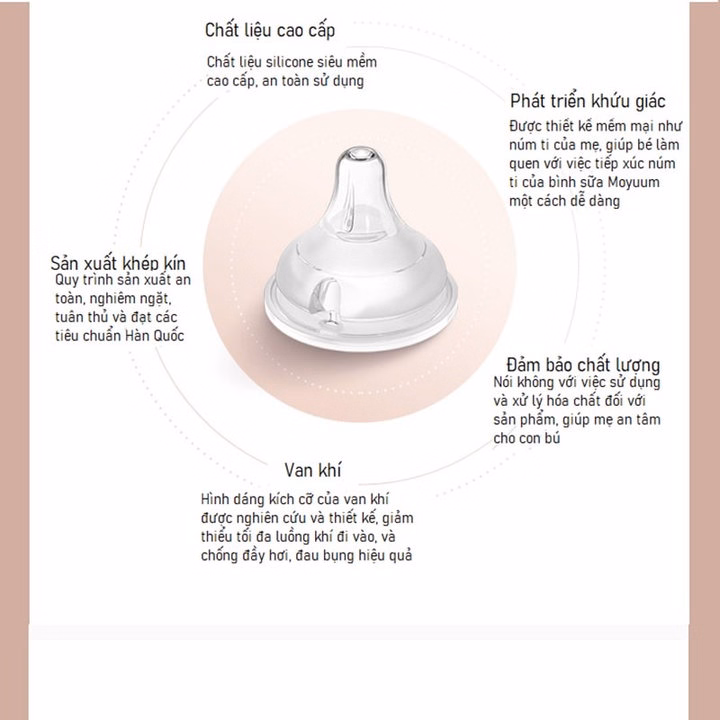 Moyuum được các mẹ đánh giá là bình sữa có núm ti giống với ti mẹ nhất nên mang lại cảm giác thân quen, giúp bé dễ dàng thích nghi khi chuyển từ bú mẹ sang bú bình.