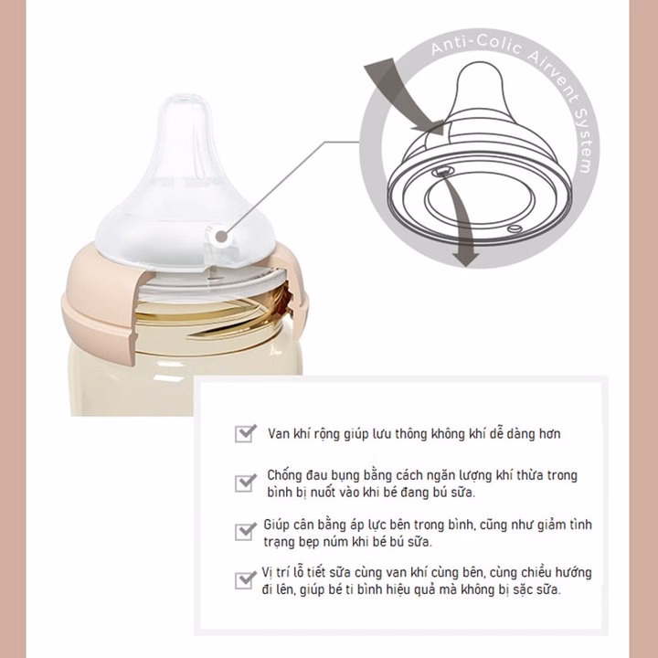 – Núm ti chất liệu silicone cùng thiết kế sáng tạo với van lưu thông khí, ngăn ngừa không khí bên ngoài tràn vào bình sữa, giúp bé không bị đau bụng, ảnh hưởng hệ tiêu hóa, tránh tình trạng ọc, tràn sữa khi uống.