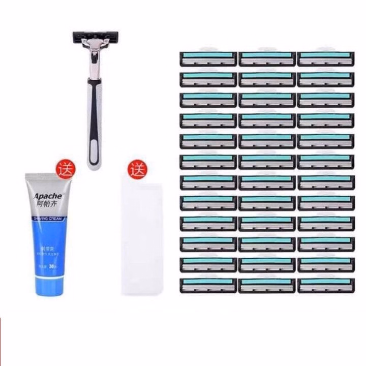 Set gồm: 1 dao cạo+ 36 bàn cạo kèm dao lam + 1 tuýp kem cạo râu.
