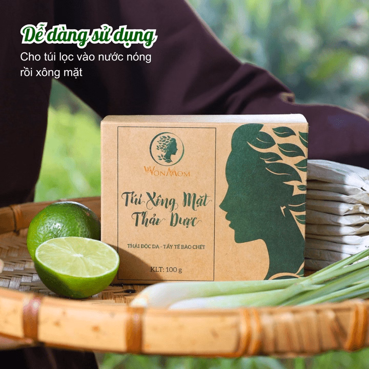 Thảo mộc xông mặt Wonmom gồm hoa hồng, bạch chỉ, tía tô, ngải cứu, bạc hà, sả, chanh và một số thảo dược khác, giúp đẩy mụn ẩn, làm sạch sâu da, se khít lỗ chân lông, đào thải độc tố và trẻ hóa làn da.