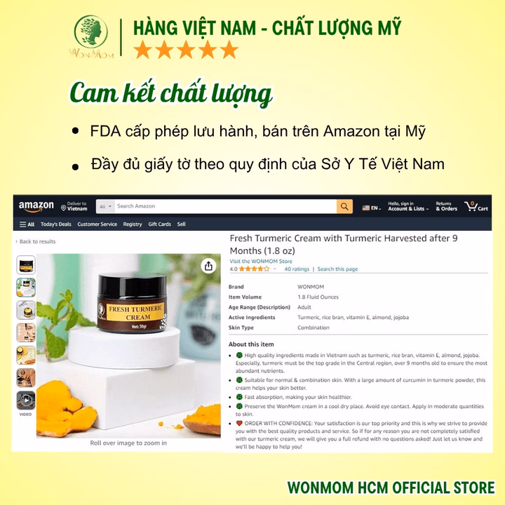 Kem nghệ tươi Wonmom với 100% nguồn gốc tự nhiên: Nghệ, cám gạo, Vitamin E, hạnh nhân, jojoba giúp xóa mờ vết thâm mụn, tàn nhang, se khít lỗ chân lông đồng thời tái tạo làn da trắng hồng hiệu quả.