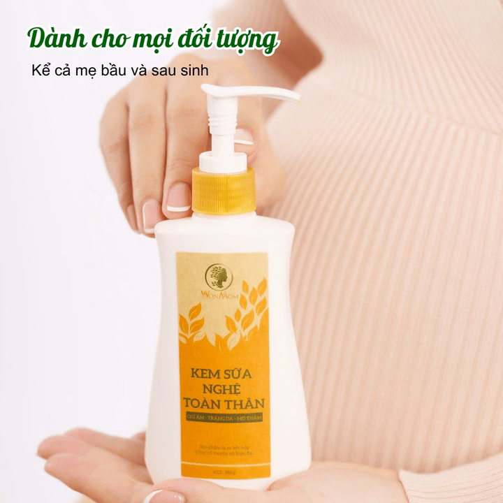 Kem sữa nghệ dưỡng trắng da toàn thân Wonmom với thành phần 100% nguồn gốc tự nhiên: Nghệ, tinh dầu nghệ, dầu hạt nho, dầu jojoba, nhân sâm, vitamin E và một số tinh dầu khác dưỡng da trắng hồng tự nhiên.