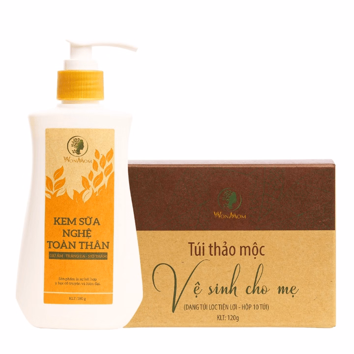 Bộ dưỡng trắng hồng da mặt, ngăn ngừa mụn, khử mùi, se khít vùng kín Wonmom là bộ sản phẩm bao gồm 2 sản phẩm: Kem sữa nghệ toàn thân và hộp thảo mộc xông vùng kín.