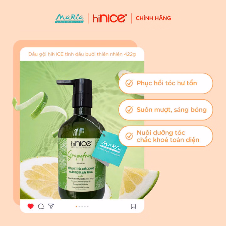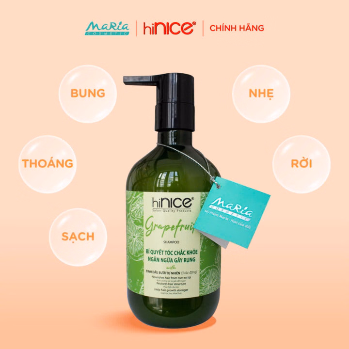 Dầu gội tinh dầu bưởi thiên nhiên Hinice Grapefruit Shampoo hỗ trợ giảm rụng tóc, mọc tóc. Giúp tóc chắc khoẻ từ gốc đến ngọn hạn chế gãy, chẻ ngọn, tóc mỏng, yếu.