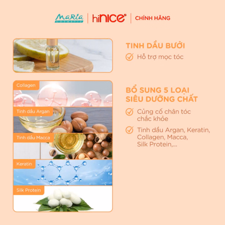 – Thành phần chính: Chiết xuất tinh dầu bưởi, dầu macca, dầu argan, keratin, collagen.
