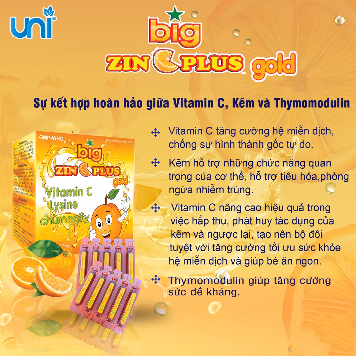 Big Zinc Plus Gold giúp bổ sung Vitamin C, Thymomodulin cho cơ thể. Hỗ trợ hạn chế quá trình oxy hóa, tăng cường sức khỏe và nâng cao sức đề kháng.