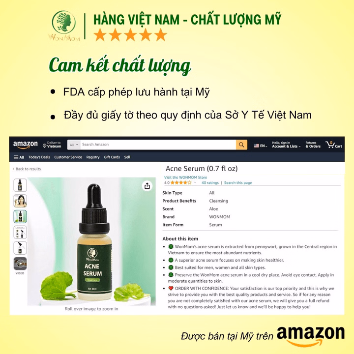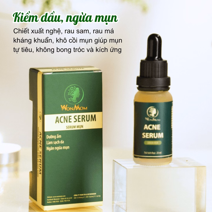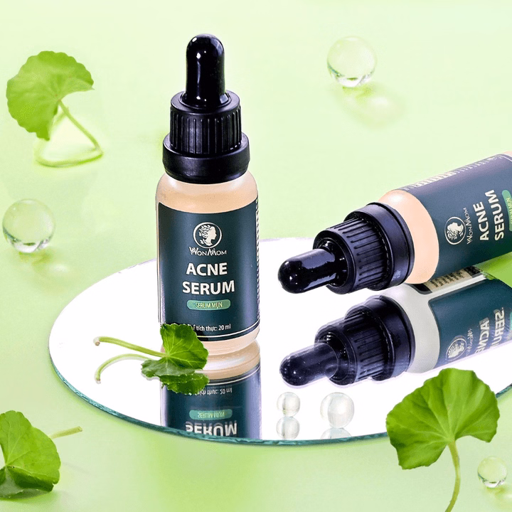 Serum trị mụn, trị thâm, tái tạo da cho mẹ bầu và sau sinh Wonmom được làm từ những nguyên liệu tự nhiên chiết xuất rau má, lộc đề, Zinc bum, vitamin B5.