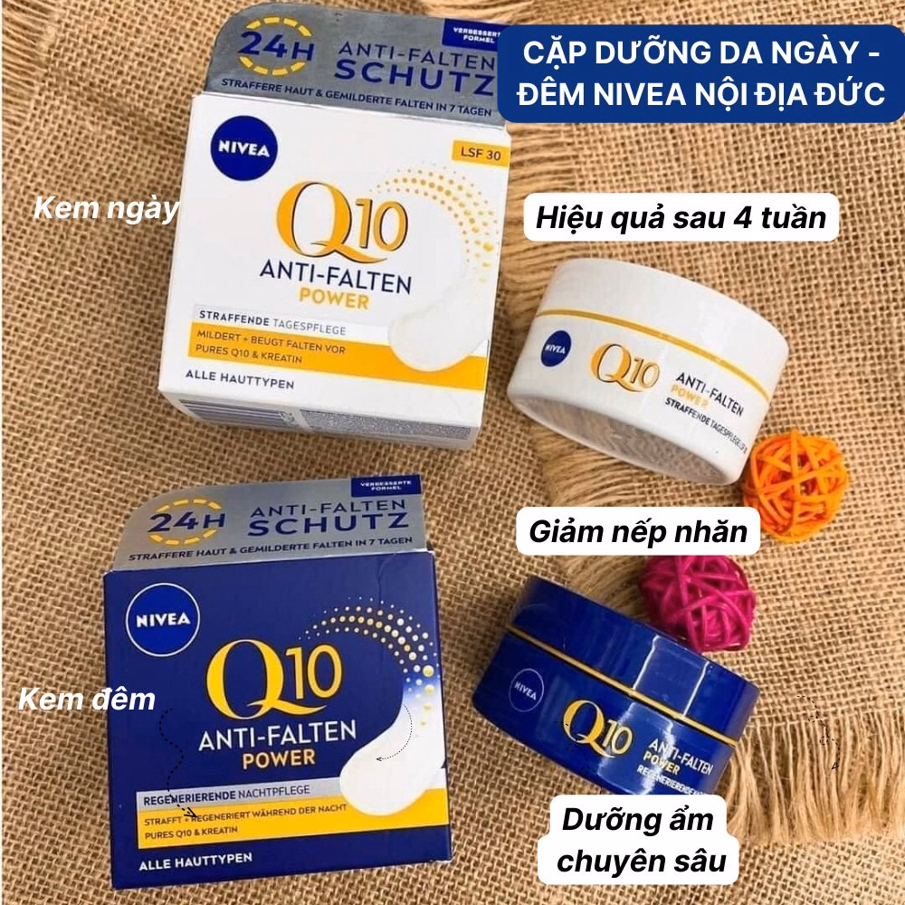 ⚡ Kem dưỡng da chống nhăn Nivea Anti-Falten Q10 plus (ngày và đêm) 50ml cung cấp độ ẩm, cho một làn da khỏe khoắn. Vitamin E trong Q10 giúp da bạn tránh được tác động của ánh sáng mặt trời suốt cả ngày. Sử dụng kết hợp 2 loại kem dưỡng da ngày và đêm, những nếp nhăn sẽ được cải thiện rõ rệt. Anti-Falten Q10 còn có thể sử dụng như lớp kem lót trang điểm, vừa giúp duy trì độ ẩm, vừa có tác dụng bảo vệ làn da.