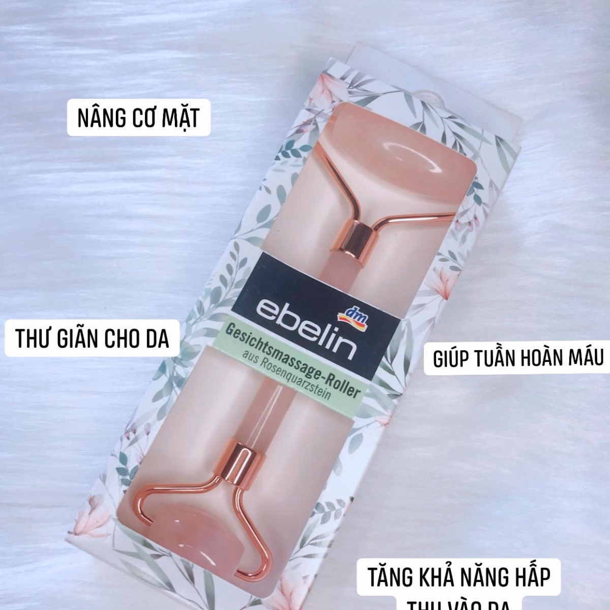 Cây lăn mặt Ebelin Gesichtsmassage-Roller bằng đá thạch anh hồng giúp matxa thư giãn khuôn mặt, tăng tuần hoàn máu, làm săn chắc và nâng cơ, cho làn da hồng hào trẻ trung hơn. Cây lăn thạch anh thường được kết hợp với các loại kem dưỡng, serum, essence hay mặt nạ giấy để giúp dưỡng chất thẩm thấu vào da tốt hơn