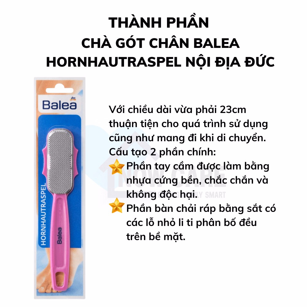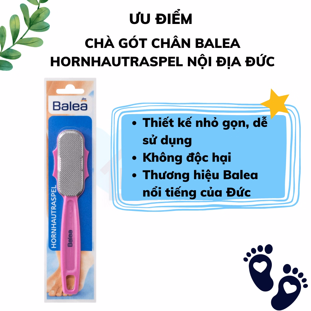 Chà gót chân Balea Hornhautraspel giúp loại bỏ nhẹ nhàng mà hiệu quả những vết chai và da cứng trên bàn chân. Cho hiệu quả cao mà chỉ cần chà xát nhẹ nhàng, mang lại làn da mềm mại chỉ với thiết kế nhỏ gọn giúp việc vệ sinh gót chân được dễ dàng và kỹ lưỡng.