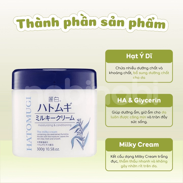 Kem Dưỡng Hatomugi Chiết Xuất Ý Dĩ Làm Sáng Mịn 300g là dòng kem dưỡng đến từ thương hiệu mỹ phẩm Hatomugi của Nhật Bản, với thành phần chính từ 81% là nước và hạt ý dĩ cải thiện tình trạng khô ráp và mang đến làn da căng mướt, mịn màng, rạng rỡ. Bên cạnh đó, hỗ trợ làm dịu và làm sáng mịn.