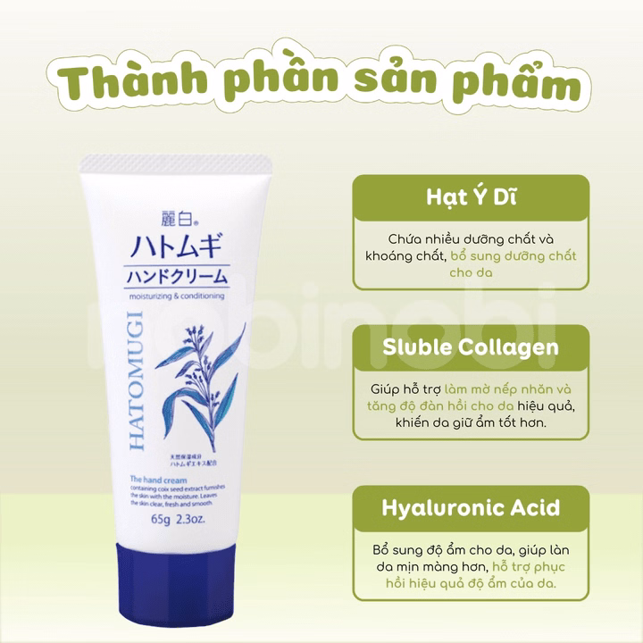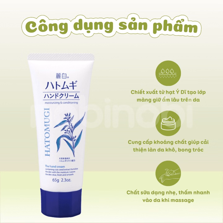 Kem Dưỡng Tay đến từ thương hiệu Hatomugi Nhật Bản, sản phẩm với thành phần chiết xuất từ hạt ý dĩ giúp cung cấp dưỡng chất và độ ẩm cho da tay, giúp da tay mềm mịn và tươi sáng hơn.