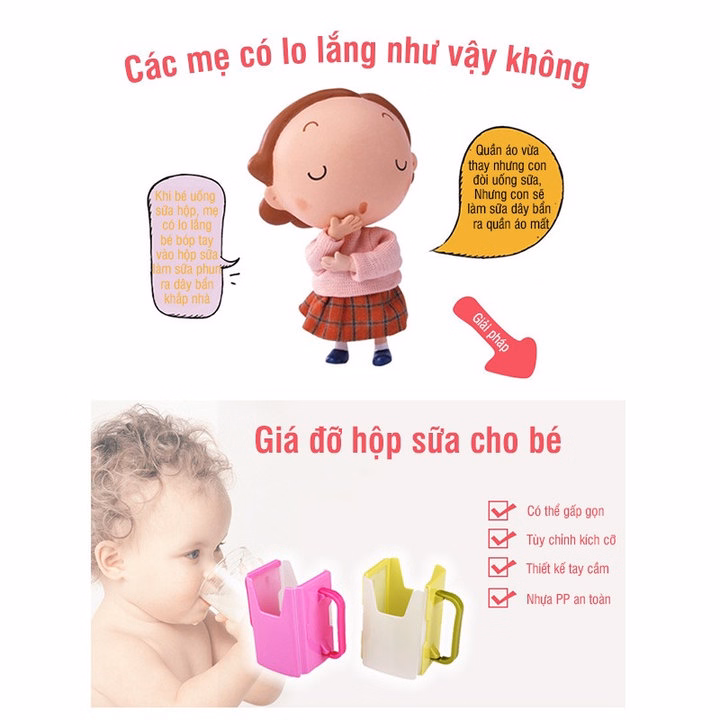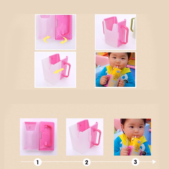 – Giai đoạn bé tập uống là thời điểm bé rất hiếu động, rất thích tự tay cầm nắm mọi đồ vật, nếu mẹ tự đưa cho bé cầm hộp sữa/ nước hoa quả bé có thể làm đổ ra ngoài vì bé chưa ý thức được mọi việc bé đang làm. Chính vì thế nếu mẹ có một dụng cụ hỗ trợ để hộp sữa có tay cầm thì sẽ rất an toàn cho bé
