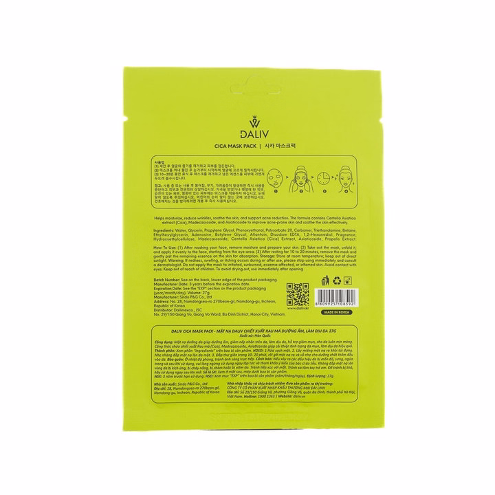 Mặt nạ Daliv chiết xuất Rau má dưỡng ẩm, làm dịu da với chiết xuất Rau má, Madecassoside và Asiaticoside, sản phẩm giúp làm dịu nhanh vùng da nhạy cảm, mẩn đỏ, đồng thời phục hồi tổn thương. Kết cấu thẩm thấu nhanh, mang lại cảm giác dịu mát, dễ chịu.