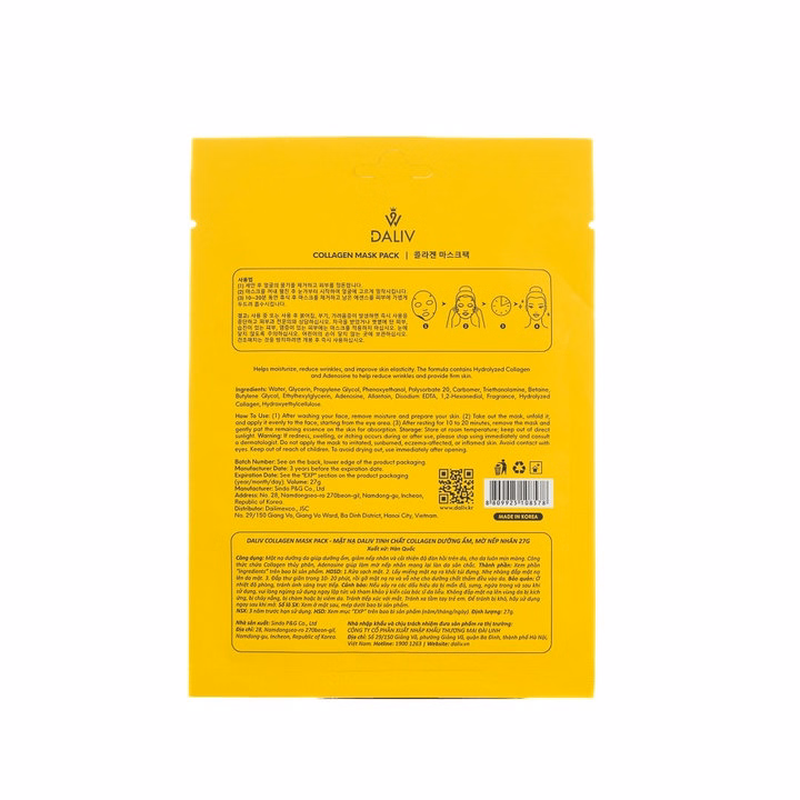 Mặt nạ Daliv tinh chất Collagen dưỡng ẩm, mờ nếp nhăn cung cấp độ ẩm dồi dào và cải thiện độ đàn hồi da nhờ Collagen thủy phân. Công thức bổ sung Adenosine giúp làm mờ nếp nhăn, mang lại làn da săn chắc và mịn màng hơn từng ngày.