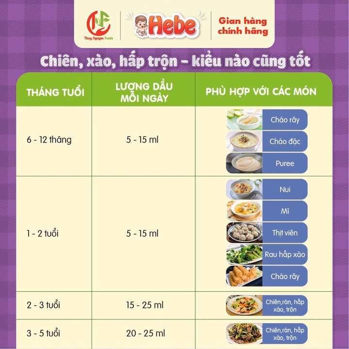 Dùng ~5ml dầu theo nhu cầu nêm vào cháo, bột, các món ăn sau khi tắt bếp để giữ trọn dưỡng chất và mùi vị, hoặc có thể trộn trực tiếp vào các thức ăn đã chín còn ấm.