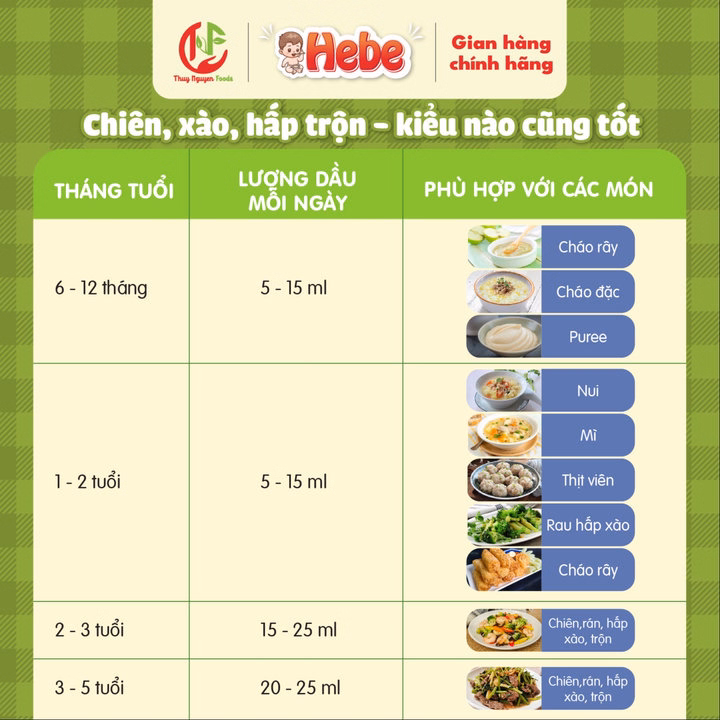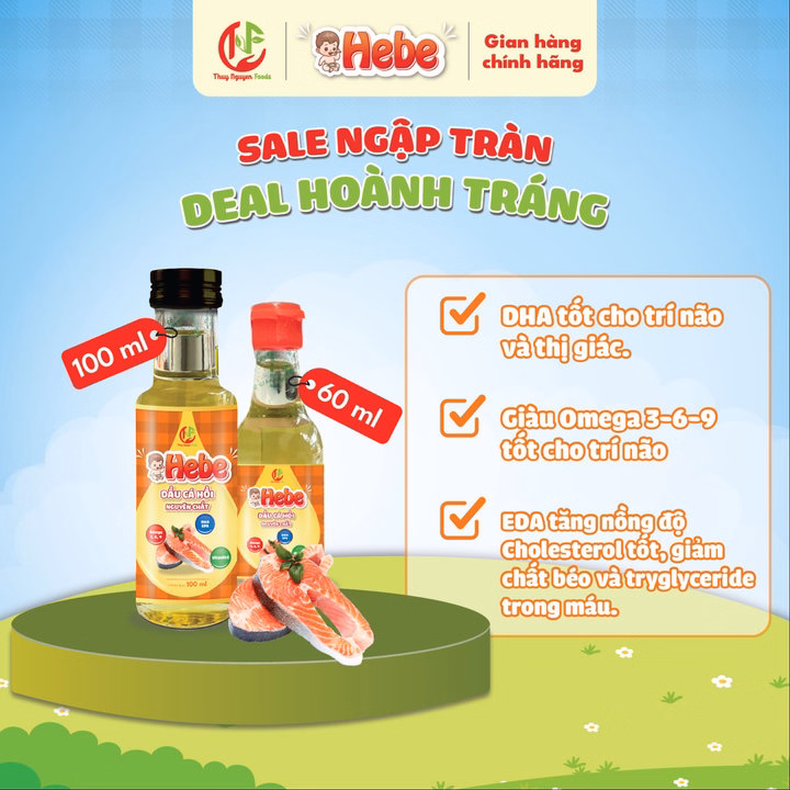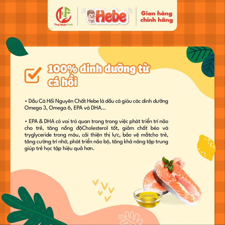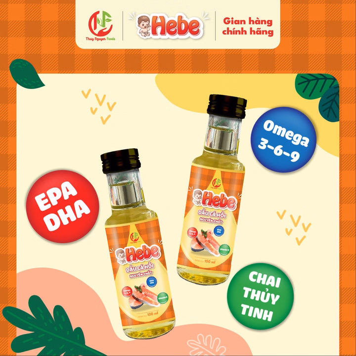 Dầu Cá Hồi Nguyên Chất Hebe từ 100% Nguyên Chất, cung cấp các dưỡng chất thiết yếu cho con như Omega 3, Omega 6, Epa & Dha trong hành trình ăn dặm.