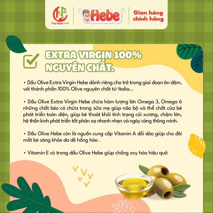 – Dầu Olive Extra Virgin Hebe dành riêng cho trẻ trong giai đoạn ăn dặm, với thành phần 100% Olive nguyên chất từ Italia…Dầu Olive Extra Virgin Hebe chứa hàm lượng lớn Omega 3, Omega 6 những chất béo có chứa trong sữa mẹ giúp não bộ và thể chất của bé phát triển toàn diện, giúp bé thoát khỏi tình trạng còi xương, chậm lớn, hệ thần kinh phát triển tốt phản xạ nhanh nhẹn và ngày càng thông minh.Dầu Olive Hebe còn là nguồn cung cấp Vitamin A dồi dào giúp cho đôi mắt bé sáng khỏe da dẻ hồng hào. Vitamin E có trong dầu Olive Hebe