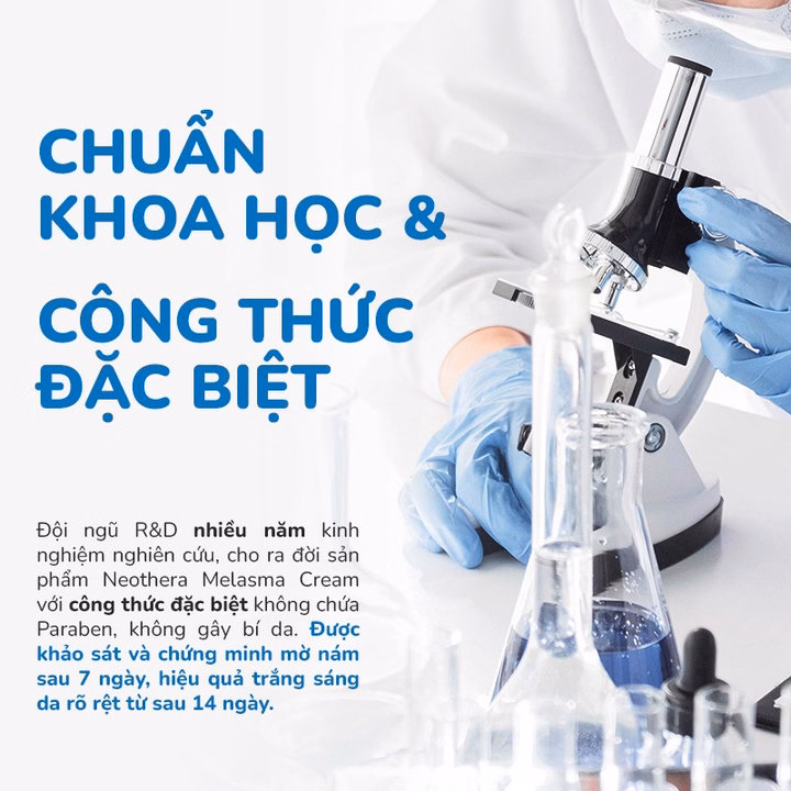 Kem nám Neothera Melasma Cream chứa Tổ Hợp Khoa Học “Triple Action – T.A.K” gồm Tranxemic Acid, Alpha Arbutin và Mận Kakadu giàu vitamin C thông qua cơ chế “ức chế sản xuất melanin” từ bên trong giúp giảm nám sau 2 tuần và trắng sáng da sau 7 ngày. Kem Không chứa Corticoid gây mòn mỏng, mẫn cảm da. Đã được kiểm định độ an toàn bởi Sở Y Tế.