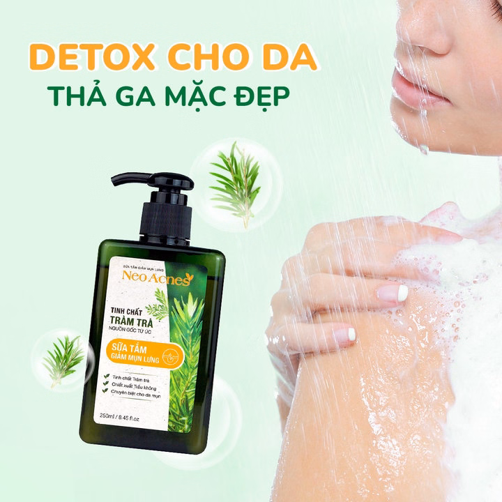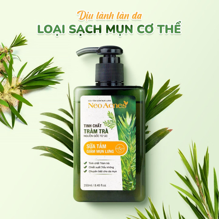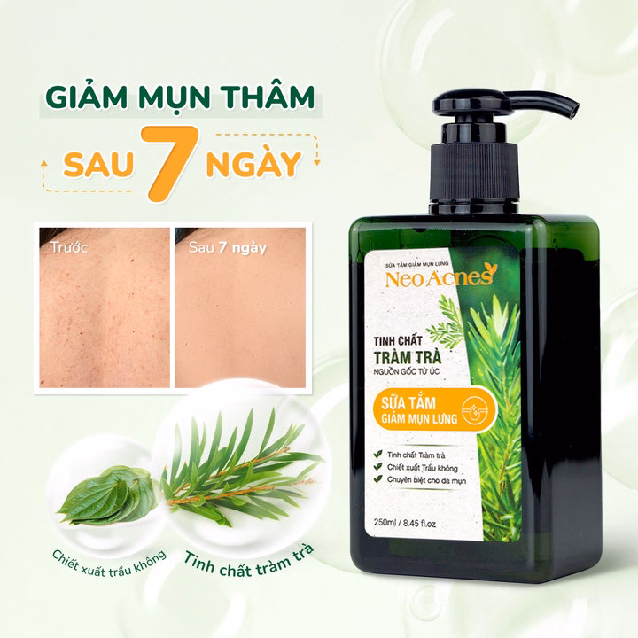 Sữa tắm mụn lưng, giảm nang lông, ngừa thâm mụn chiết xuất Tràm trà úc và trầu không Neoskin. Giảm mụn lưng thiên nhiên Neo Acnes chứa Tinh chất tràm trà từ cây Tràm Trà có nguồn gốc từ Tràm Trà Melaleuca Alternifolia Úc, sở hữu tính kháng khuẩn tự nhiên rất tốt, có thể làm khô và se còi mụn, mụn trứng cá nhanh gấp 3 lần các loại khác. Neoacnes là giải pháp chăm sóc da mụn body, vim lỗ chân lông một cách an toàn và lành tính.