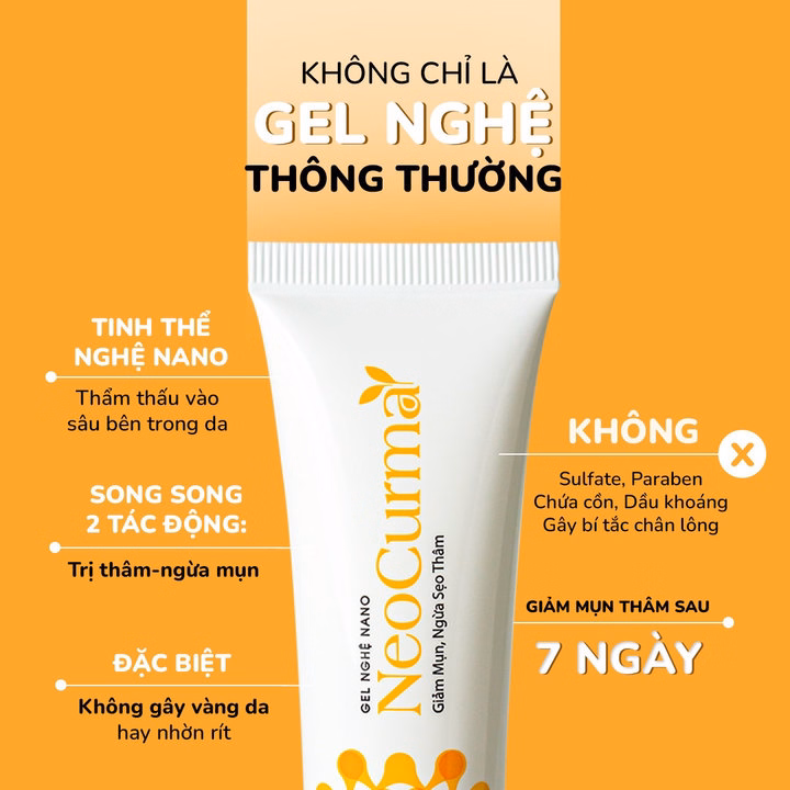 Ngày nay, với công nghệ phát triển trong quá trình sản xuất vẫn giữ được lượng Curcumin trong củ nghệ đặc biệt đã được chiết lọc tối đa tạp chất và tăng khả năng hòa tan tạo ra các phân tử siêu nhỏ (30nm – 100nm), giúp Gel nghệ nano Neocurma thẩm thấu vào sâu bên trong da, không gây vàng da hay nhờn rít, giúp giảm mụn, ngăn ngừa vết thâm sẹo sau “trận mụn”, phù hợp cho mọi loại da, cho mọi thời tiết.
