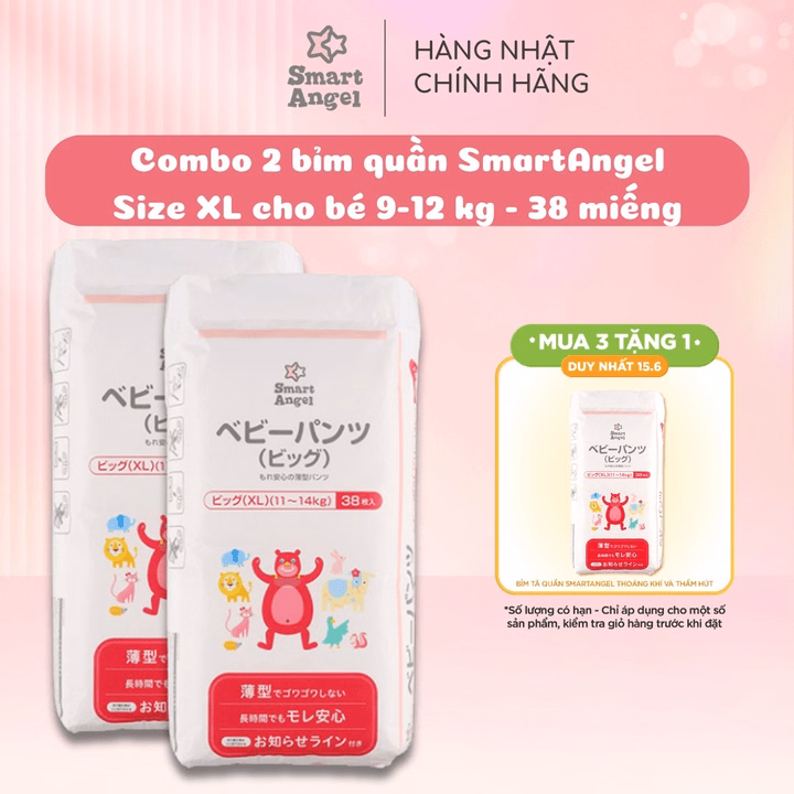 Combo 2 Tã/Bỉm Quần Smart Angel Cho Bé Từ 11-14Kg 38 Miếng (Hàng Nội Địa Nhật)