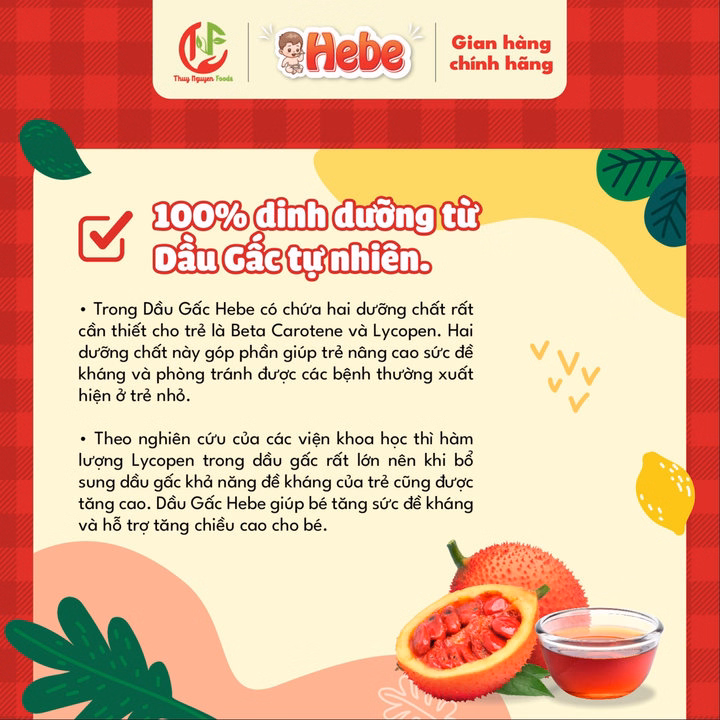 -Dầu Gấc tự nhiên Hebe mang đến các dưỡng chất thiết yếu cho con như Omega 3-6-9, Vitamin A, vitamin E giúp phát triển trí não của bé.