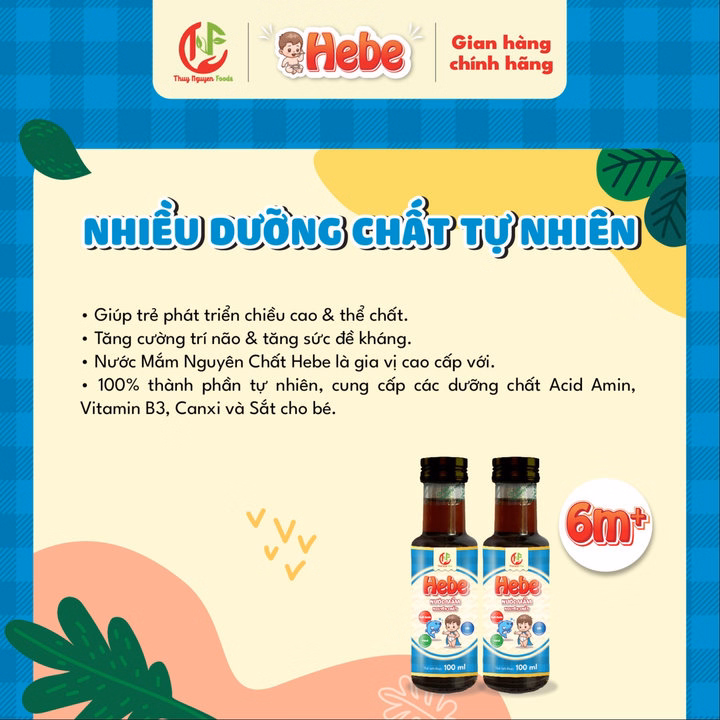 -Nước mắm Nguyên Chất Hebe là sản phẩm gia vị với thành phần nguyên liệu 100% tự nhiên và được sản xuất bằng phương pháp ủ chượp trong thùng gỗ truyền thống đặc trưng tại Phan Thiết. Nhờ vậy mà các dưỡng chất tinh túy được chắt chiu và giữ trọn trong từng giọt nước mắm đậm đà, có vị ngọt dịu tự nhiên từ thịt cá nên kích thích vị giác giúp bé ăn ngon miệng và hấp thu dưỡng chất tối ưu.