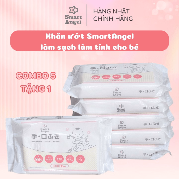 Combo 5 Tặng 1 Khăn Giấy Ướt Smartangel Chiết Xuất Từ Nước Tinh Khiết Không Mùi Cho Bé (80 Miếng X 1 Gói)