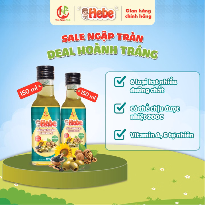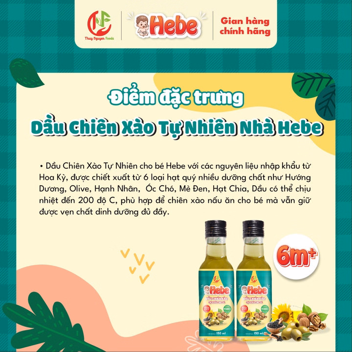 -Dầu Chiên Xào Tự Nhiên cho bé Hebe với các nguyên liệu nhập khẩu từ Hoa Kỳ, được chiết xuất từ 6 loại hạt quý nhiều dưỡng chất như Hướng Dương, Olive, Hạnh Nhân, Óc Chó, Mè Đen, Hạt Chia, Dầu có thể chịu nhiệt đến 200 độ C, phù hợp để chiên xào nấu ăn cho bé mà vẫn giữ được vẹn chất dinh dưỡng đủ đầy.