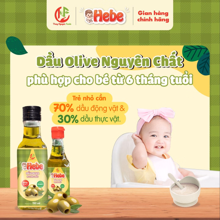 -Dầu Olive Extra Virgin Hebe dành riêng cho trẻ trong giai đoạn ăn dặm, với thành phần 100% Olive nguyên chất từ Italia…Dầu Olive Extra Virgin Hebe chứa hàm lượng lớn Omega 3, Omega 6 những chất béo có chứa trong sữa mẹ giúp não bộ và thể chất của bé phát triển toàn diện, giúp bé thoát khỏi tình trạng còi xương, chậm lớn, hệ thầnkinh phát triển tốt phản xạ nhanh nhẹn và ngày càng thông minh.Dầu Olive Hebe còn là nguồn cung cấp Vitamin A dồi dào giúp cho đôi mắt bé sáng khỏe da dẻ hồng hào. Vitamin E có trong dầu Olive Hebe