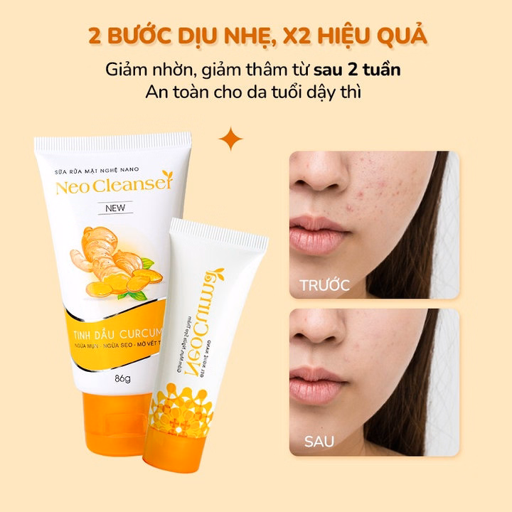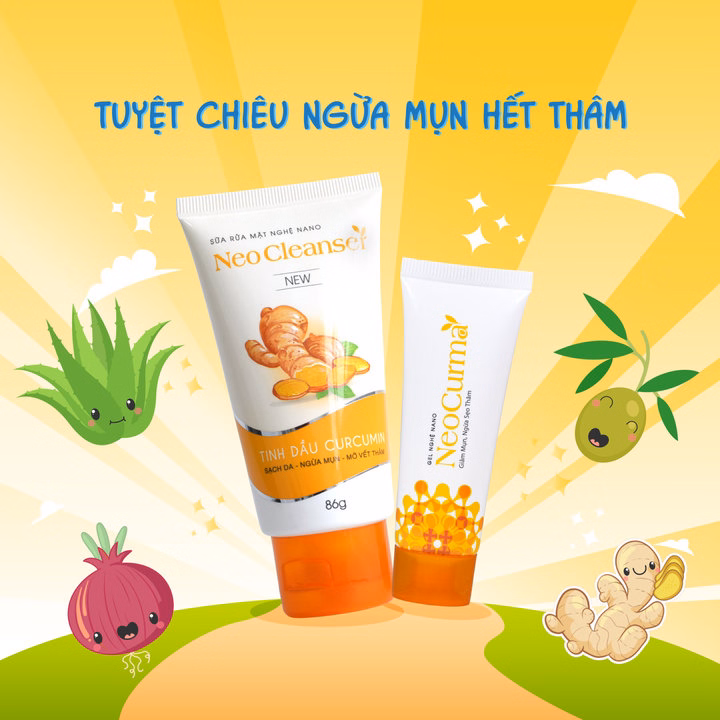 Combo Dưỡng Da Ngừa Mụn Mờ Thâm: Sữa Rửa Mặt, Gel Chấm Mụn Nano Nghệ Curcumin Neoskin An Toàn, Lành Tính
