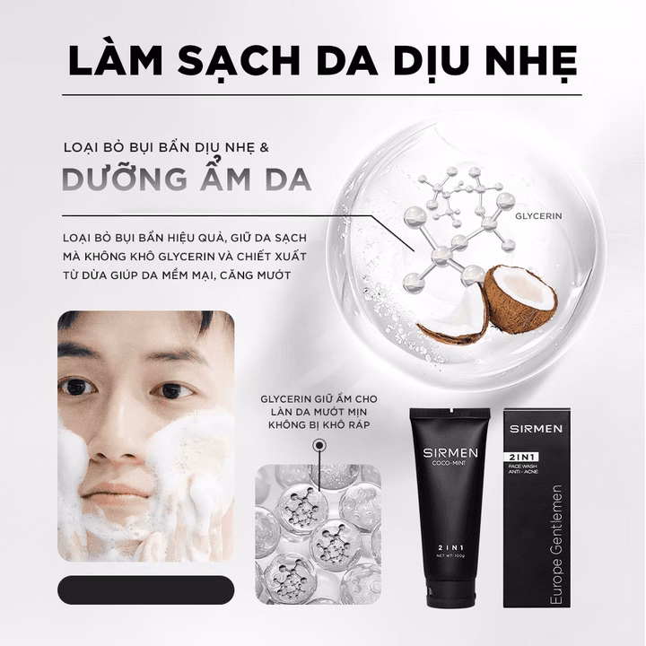 2. Sữa rửa mặt nam 2 in 1 nguyên liệu châu Âu Sirmen Europe Gentlemen dòng cao cấp 100g chiết xuất tự nhiên công nghệ Eu-Nano tác dụng gấp 2 lần sản phẩm thông thường.
