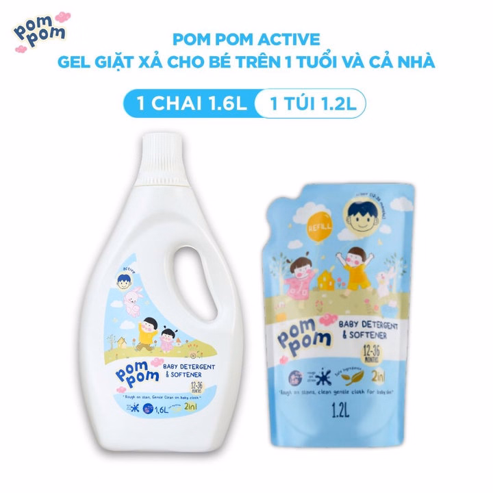 Gel Giặt Xả 2in1″Lành” cho cả nhà Pompom Active Sạch Sâu Vết bẩn – Dưỡng Mới Vải – Lưu Hương Tích hợp Kháng Khuẩn an toàn cho đồ lót-Combo refill