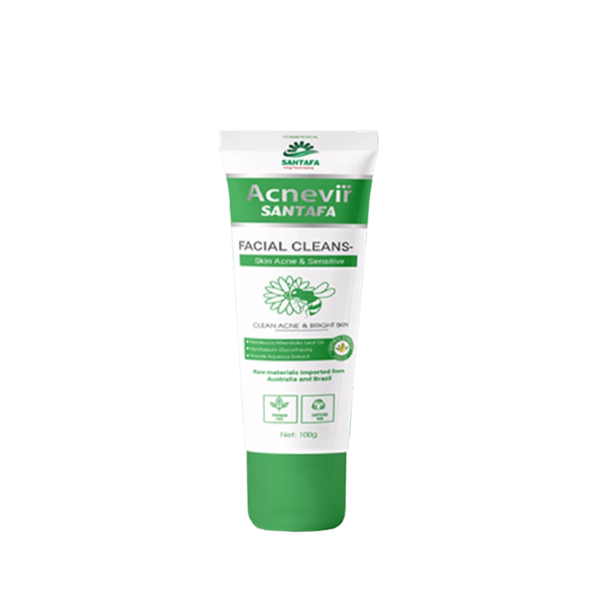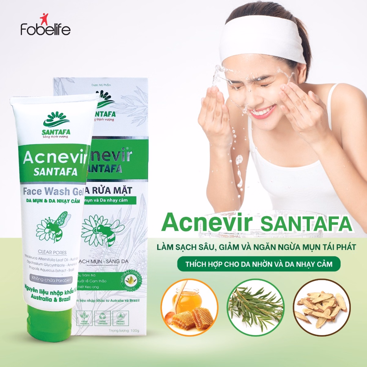 Sữa rửa mặt Acnevir Santafa với các thành phần từ tự nhiên như Keo ong xanh (Brazil), tinh dầu tràm trà (Australia), tinh chất rễ cam thảo rất an toàn dịu nhẹ. Thích hợp sử dụng do người da nhờn và da nhạy cảm giúp làm sạch da từ sâu bên trong, làm giảm và ngăn ngừa mụn tái phát.