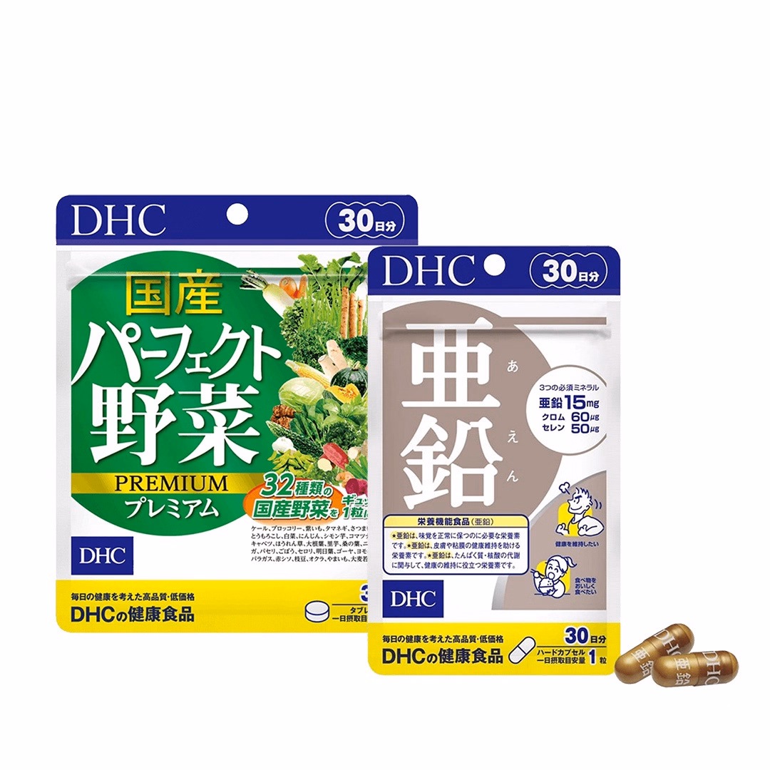 Thành phần: Viên Uống Dhc Zinc: kẽm gluconat: 120mg (tương đương 15mg kẽm); chiết xuất nấm men (0,2% crôm): 30mg; chiết xuất nấm men (0,2% selen): 25mg. Viên uống rau củ Dhc Perfect Vegetable: Mỗi 4 viên có chứa: bột cải bắp: 280mg, bột súp lơ xanh: 260mg, bột khoai lang tím: 220mg, bột hành: 220mg, bột khoai lang ngọt: 160mg, bột bí ngô: 160mg, bột ngô ngọt: 160mg, bột cải thảo: 72mg, bột cà rốt: 72mg, bột lá lúa mạch: 60mg, bột khoai tây ngọt: 12mg, bột cải Nhật: 12mg, bột rau đay: 4mg, bột bắp cải: 4mg, bột cải chân vịt: 4mg, bột lá cải củ: 4mg, khoai sọ: 4mg, bột dâu tằm: 4mg, bột tỏi: 4mg, bột gừng: 2mg, bột mướp đắng: 2mg…