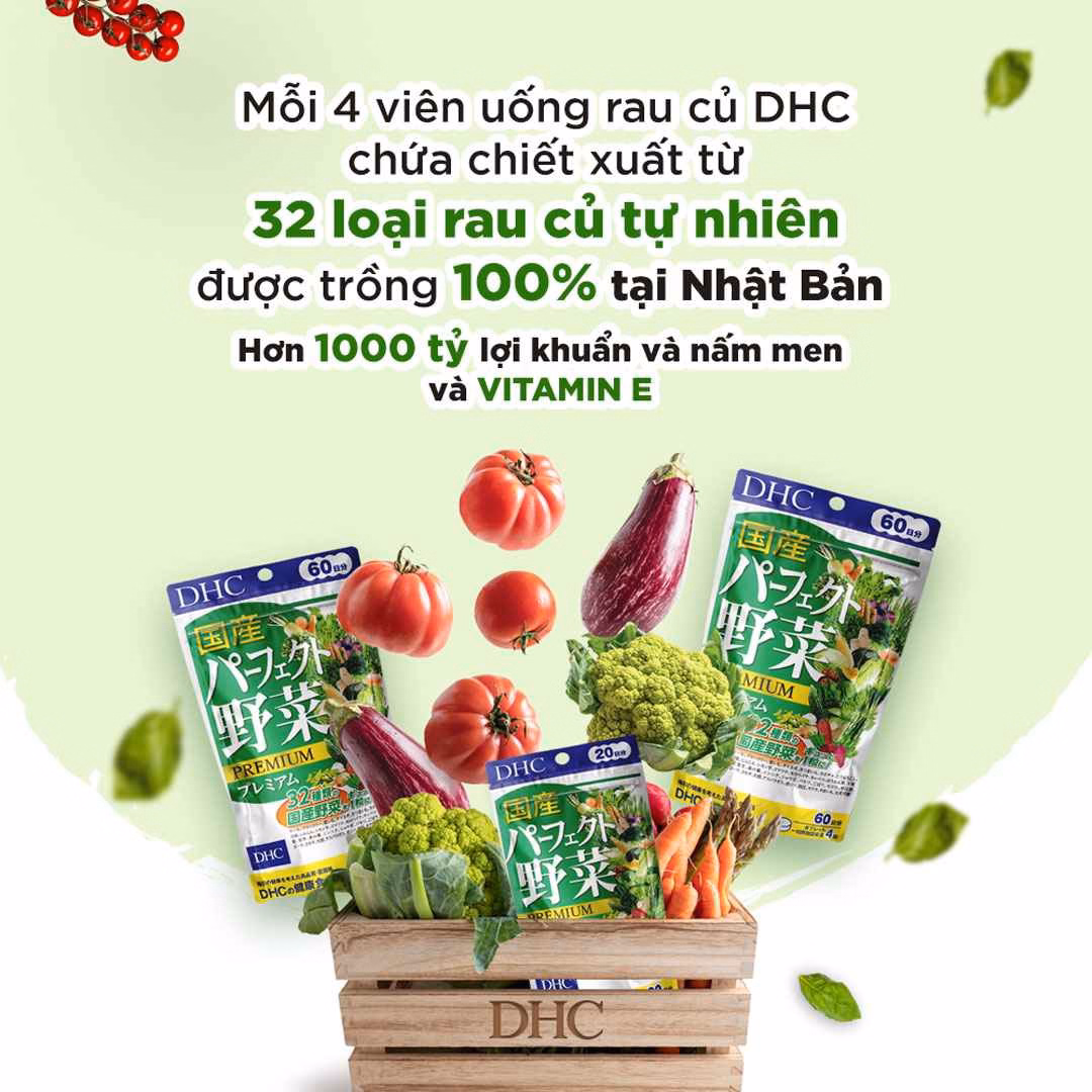 Viên uống rau củ Dhc Perfect Vegetable chiết xuất từ 32 loại rau củ được trồng tại Nhật Bản giúp bạn bổ sung các chất dinh dưỡng thiết yếu cho cơ thể mỗi ngày. Viên uống có chứa đến 1000 tỷ nấm men và lợi khuẩn acid lactic hỗ trợ hệ tiêu hóa khỏe mạnh hơn, giúp da sáng khỏe, mịn màng.