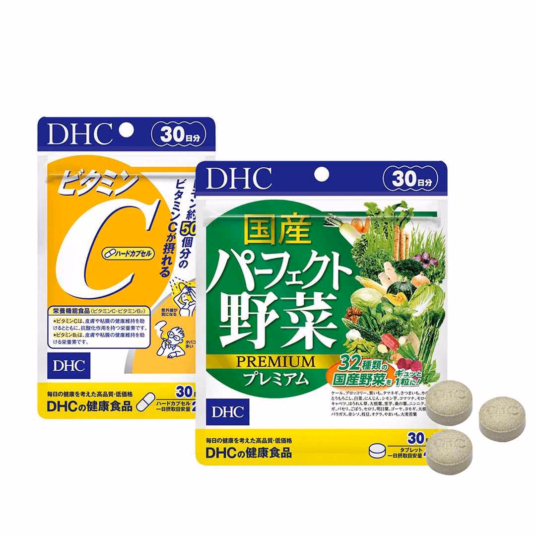 Thành phần: Viên Uống Dhc Vitamin C Hard Capsule Vitamin C: Vitamin C, vitamin B2, gelatin, caramel, titan dioxide vừa đủ hai viên. Viên uống rau củ Dhc Perfect Vegetable: Mỗi 4 viên có chứa: bột cải bắp: 280mg, bột súp lơ xanh: 260mg, bột khoai lang tím: 220mg, bột hành: 220mg, bột khoai lang ngọt: 160mg, bột bí ngô: 160mg, bột ngô ngọt: 160mg, bột cải thảo: 72mg, bột cà rốt: 72mg, bột lá lúa mạch: 60mg, bột khoai tây ngọt: 12mg, bột cải Nhật: 12mg, bột rau đay: 4mg, bột bắp cải: 4mg, bột cải chân vịt: 4mg, bột lá cải củ: 4mg, khoai sọ: 4mg, bột dâu tằm: 4mg, bột tỏi: 4mg, bột gừng: 2mg, bột mướp đắng: 2mg…