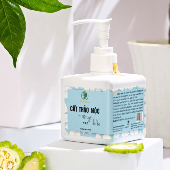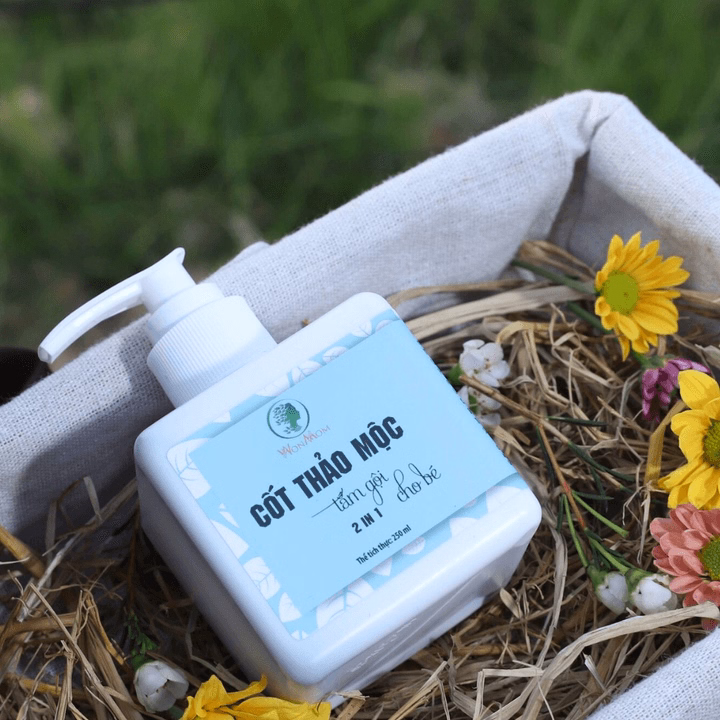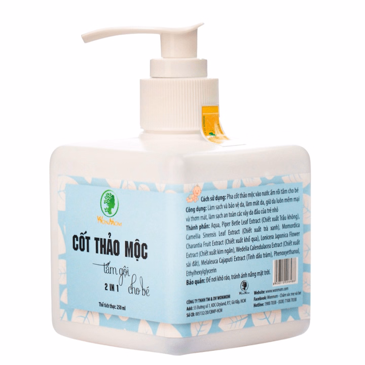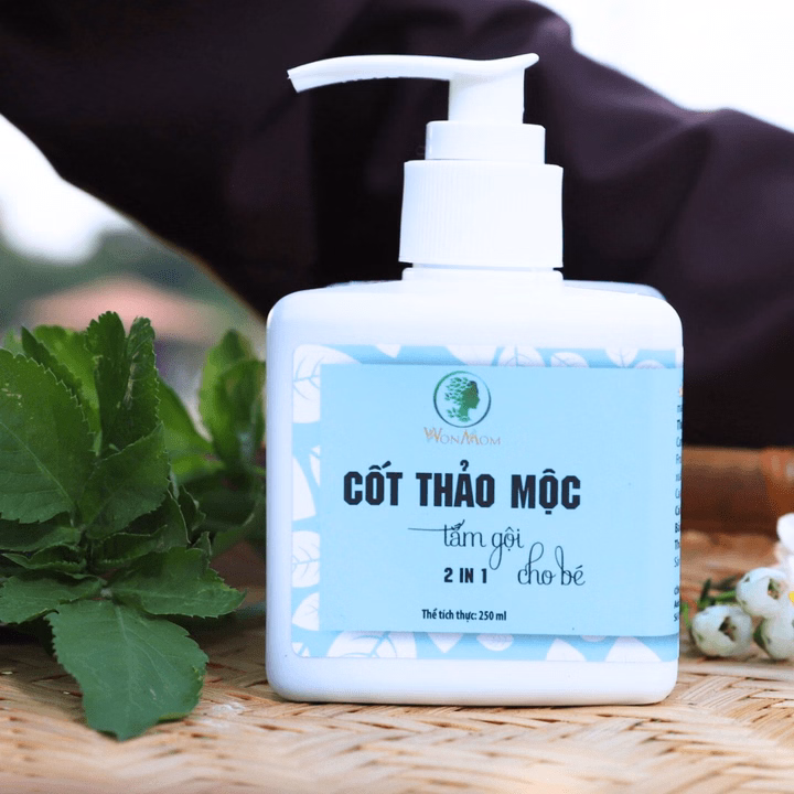 Cốt thảo mộc tắm và gội cho bé Wonmom là 1 trong số 10 sản phẩm được nhiều mẹ bỉm sữa tin dùng với nguyên liệu 100% thảo mộc thiên nhiên: Chiết xuất trầu không, khổ qua, trà xanh, kim ngân, sài đất, tràm trà.