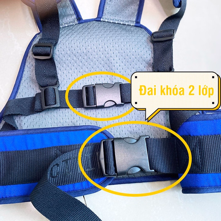 Thiết kế đai với 2 quai quàng lên vai trẻ và 1 đai vòng qua bụng giữ chặt bé vào người phía trước, giúp cố định tư thế khi bé ngồi xe máy, an toàn hơn khi bạn đưa bé ra ngoài chơi.