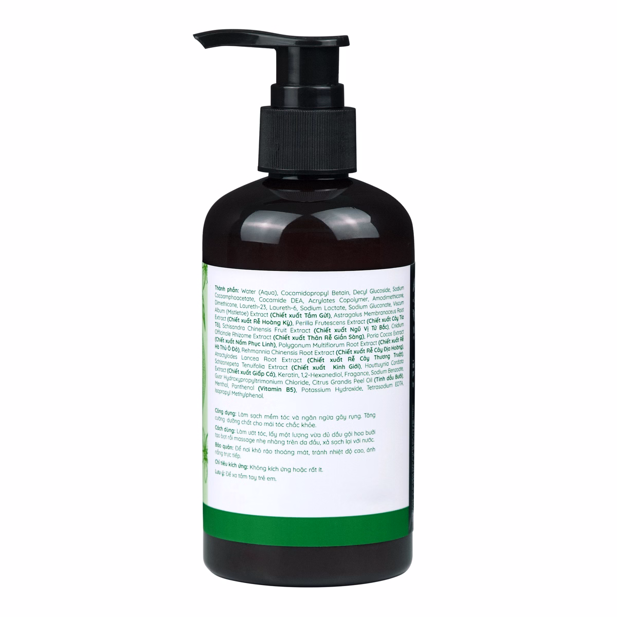 Thành phần: Water (Aqua), Cocamidopropyl Betain, Decyl Glucoside, Sodium Cocoamphoacetate, Cocamide Dea, Acrylates Copolymer, Amodimethicone, Dimethicone, Laureth-23, Laureth-6, Sodium Lactate, Sodium Gluconate, Viscum Album (Mistletoe) Extract, Astragalus Membranaceus Root Extract, Perilla Frutescens Extract, Schisandra Chinensis Fruit Extract, Cnidium Officinale Rhizome Extract, Poria Cocos Extract, Polygonum Multiflorum Root Extract, Rehmannia Chinensis Root Extract, Atractylodes Lancea Root Extract, Schizonepeta Tenuifolia Extract, Houttuynia Cordata Extract (Tầm Gửi, Rễ Cây Hoàng Kỳ, Tía Tô, Bắc Ngũ Vị Tử, Rễ Giần Sàng, Phục Linh, Rễ Hà Thủ Ô, Rễ Cây Địa Đàng, Thương Truật, Kinh Giới, Giấp Cá), Keratin, 1,2-Hexanediol, Fragance, Sodium Benzoate, Guar Hydroxypropyltrimonium Chloride, Citrus Grandis Peel Oil (Tinh Dầu Bưởi), Menthol (Tinh Dầu Bạc Hà), Panthenol (Vitamin B5), Potassium Hydroxide, Tetrasodium Edta, Isopropyl Methylphenol
