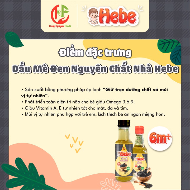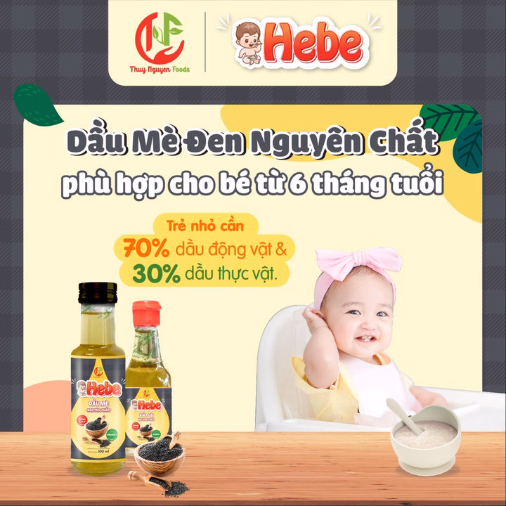 Dầu Mè Nguyên Chất Hebe được ép lạnh từ 100% hạt mè đen tuyển chọn mang đến các dưỡng chất thiết yếu cho con như Omega 3-6-9, Vitamin E và chất béo. Sản phẩm có mùi thơm dịu nhẹ không ảnh hưởng đến vị giác & giúp con ăn ngon miệng hơn