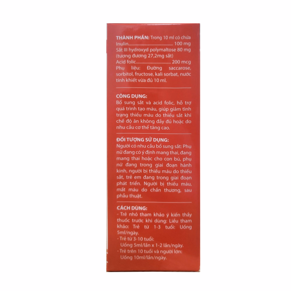 Thành phần: Inulin, Sǎt Iii hydroxyd polymaltose, Acid folic. Phu liệu: Đường saccarose, sorbitol, fructose, kali sorbat, nước tinh khiết