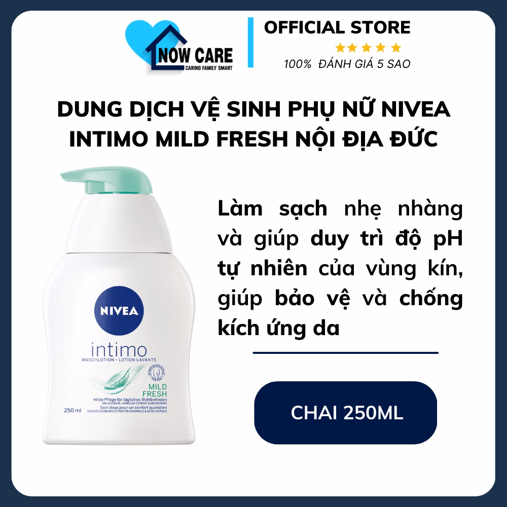Dung dịch vệ sinh phụ nữ Nivea Intimo Mild Fresh được sản xuất trực tiếp tại Đức. Giúp làm sạch nhẹ nhàng vùng kín. Chiết xuất cúc La Mã và axit lactic bảo vệ, chống kích ứng da. Làm sạch nhẹ nhàng và giúp duy trì độ Ph tự nhiên của vùng kín, không chứa cồn, không xà phòng, không phẩm màu, mùi thơm nhẹ dịu mát dễ chịu.