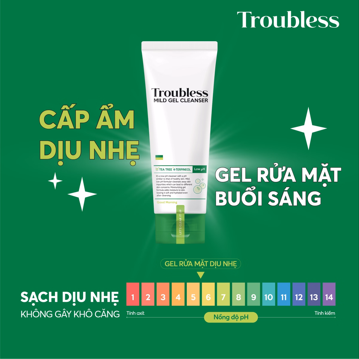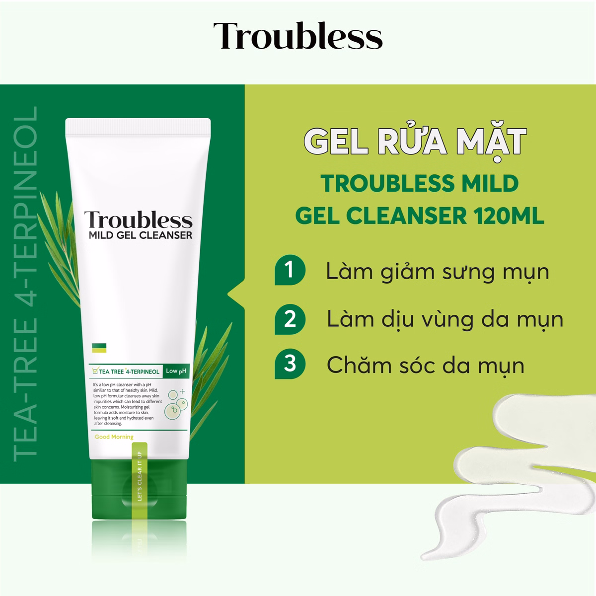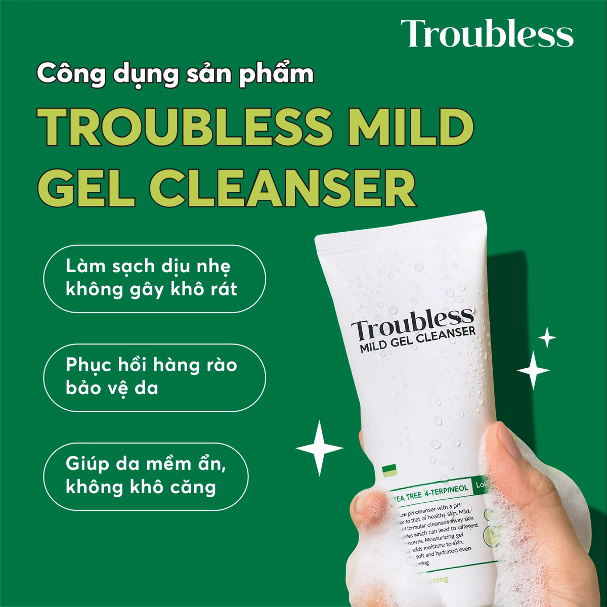 Sữa rửa mặt tạo bọt Troubless Mild Gel Cleanser mang đến công dụng chính: làm thông thoáng lỗ chân lông, loại bỏ dầu thừa và xử lý các khu vực da gặp vấn đề để nhằm giúp da mịn màng, mềm mại hơn.