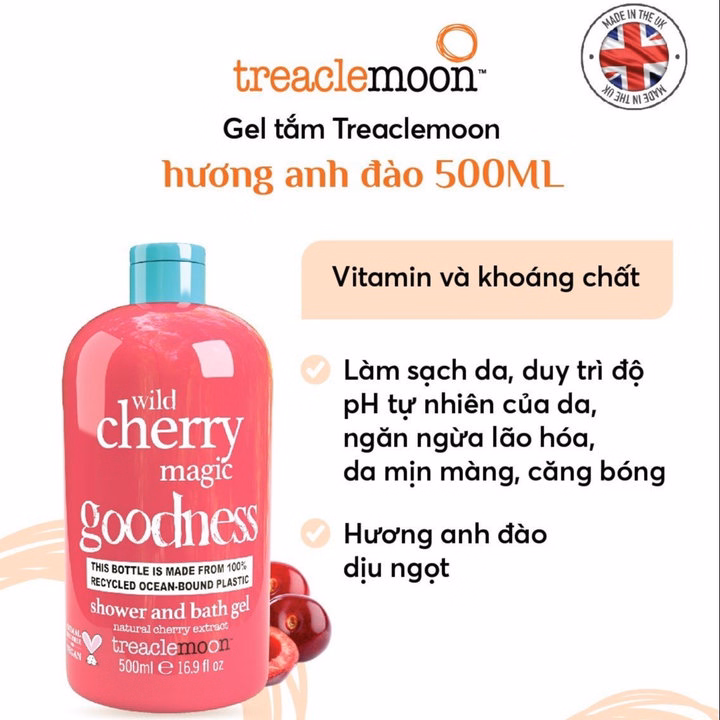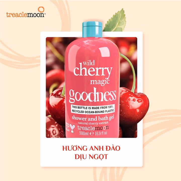 Gel tắm Treaclemoon hương anh đào 500ml là sản phẩm thuần chay, chiết xuất tự nhiên, vỏ chai được làm từ 100% nhựa tái chế đại dương. Gel tắm nhiều bọt đem đến cảm giác sạch sẽ hoàn toàn trên da cùng mùi hương tươi mát không kén chọn lứa tuổi hay giới tính. Sản phẩm không thí nghiệm trên động vật, không chứa parabens và silicone, nước hoa gây dị ứng.