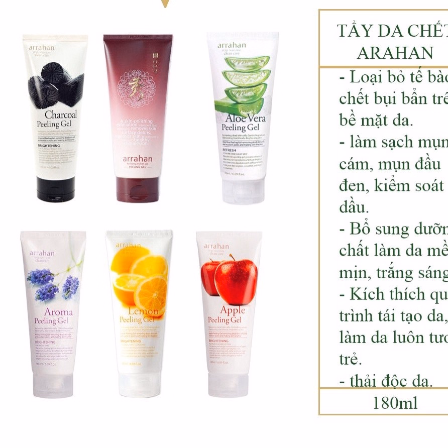 – Lô hội: Chiết xuất từ Lô hội – gel tẩy tế bào chết arrahan sẽ cho bạn làn da trắng sáng, mịn màng không tì vết. Mùi hương nồng nàn quyến rũ không gây khô da, cho da luôn mịn màng, ẩm mượt