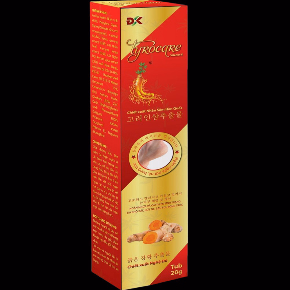 Purified watter (nước tinh khiết), Glyceryn Stearate (glycerol monostearate), Propylene Glycol, Cetearyl Alcohol, Panax Ginsheng Extract (Chiết xuất nhân sâm), Curcuma Longa Extract (Chiết xuất Nghệ đỏ), Arctium Lappa Extract (Chiết xuất Ngưu bàng), Aloe Vera Oil (Dầu Lô hội), Peg 40 Hydrogenated Castor Oil, C15-19 Alkane (Emostmart L19), Ceteareth-25 (Eumulgin B25), Sodium Citrate, Disodium Edta, Zinc Oxyd 1%, Ethylhexylglycerine (and) Phenoxyeth- anol (Siligu- ard Ehpg) 1%, Potassium Sorbate 0.2%, Tocoph- eryl Acetate (Vitamin E), Frangance (Hương liệu).