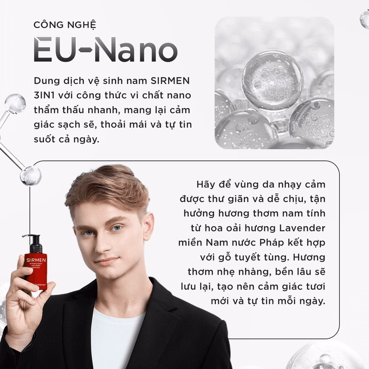 2. Dung dịch vệ sinh nam 3 trong 1 Sirmen Europe Gentlemen hương nước hoa châu Âu nam tính quyến rũ dòng cao cấp 100g chiết xuất tự nhiên bằng công nghệ Eu-Nano đậm đặc gấp 2 lần sản phẩm thông thường